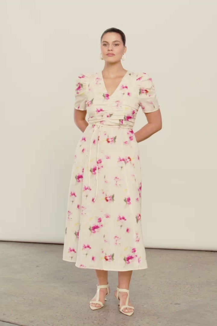 crafted in linen, the glimmer dress features a flattering v neckline with front gathers leading into a softly gathered blouson sleeve. An A line skirt creates soft movement and balances perfectly with the more fitted and defined bodice.